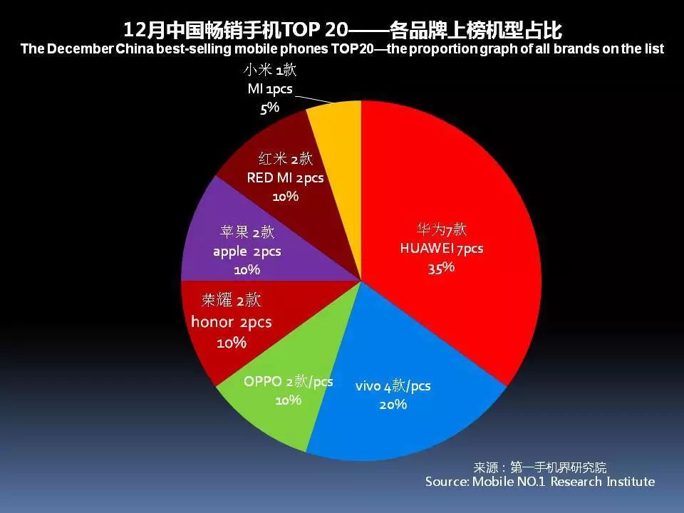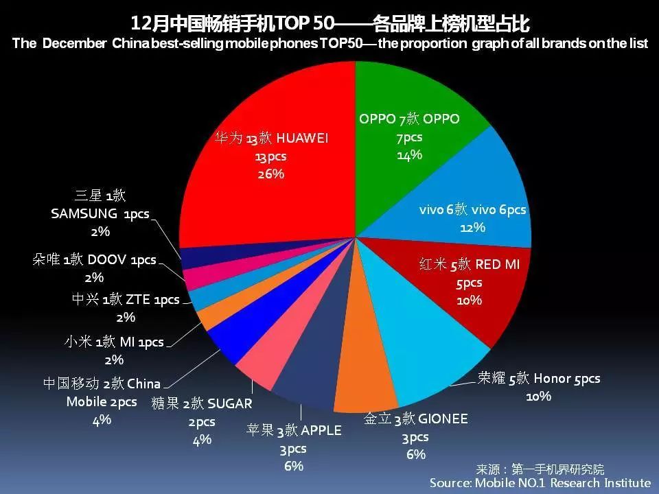 华为、OPPO、vivo、苹果、金立、小米、三星、魅族、荣耀、中国移动成为12月中国手机品牌销量TOP 10。