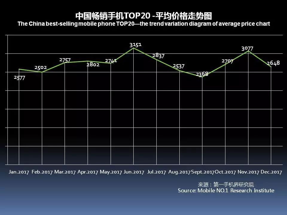 20款畅销手机平均价格在2648元,环比11月3077元,下滑了13.9%,其中主要原因是由红米进入了TOP20榜单。