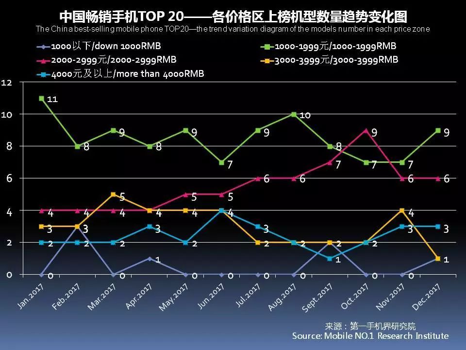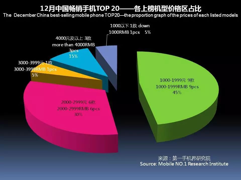 12月中国畅销手机TOP 20,超过2000元售价的机型占10款;1500-1999元价格段机型占2款;1000元-1499元价格段机型占7款;1000元以下的机型占1款。