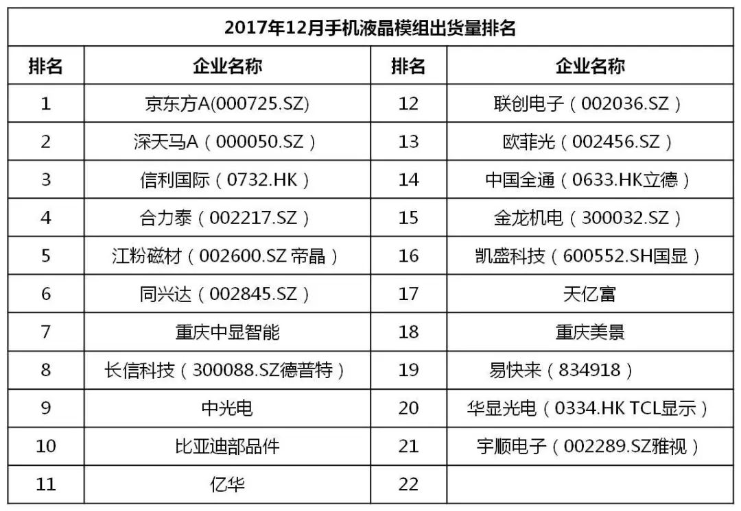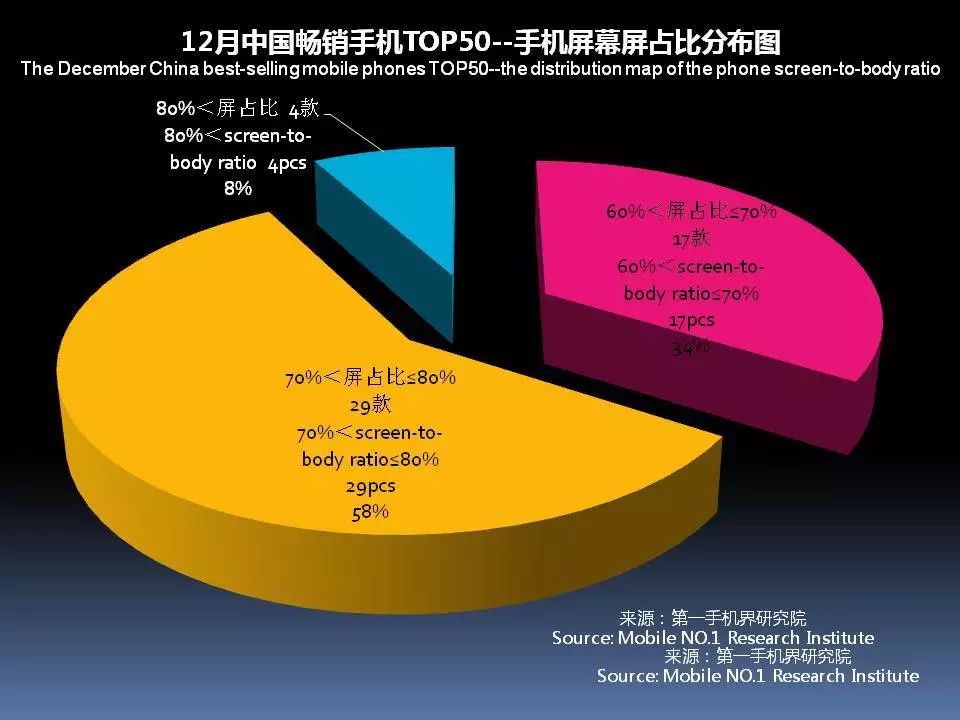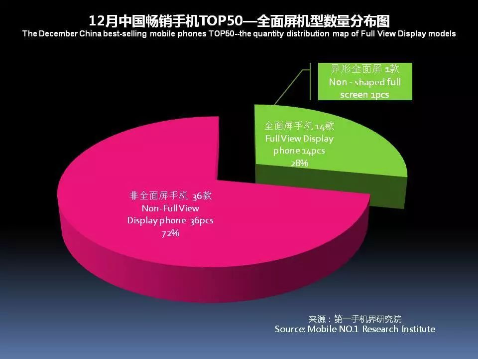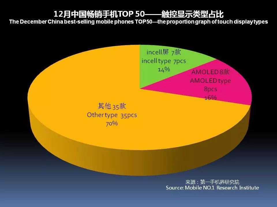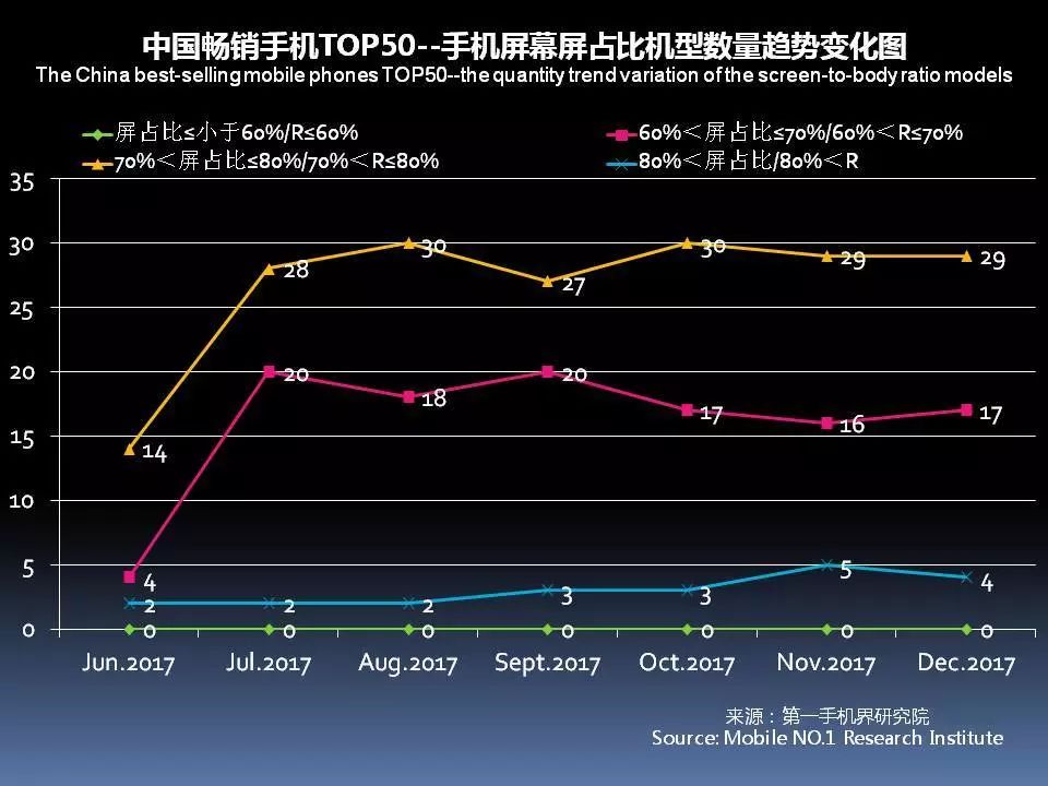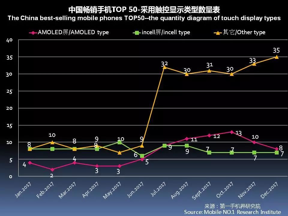 12月中国畅销手机TOP 50中,采用AMOLED屏下降至8款,说明全面屏已开始取代AMOLED成为手机卖点。