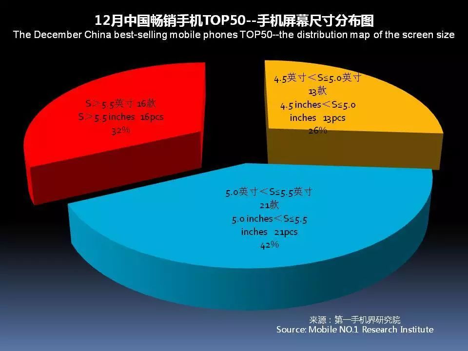 12月中国畅销手机TOP 50的手机屏幕绝大部分为5.0英寸-5.5英寸之间,占比达42%,但超过5.5英寸手机屏幕数量从10月的13款增加至12月的16款。手机屏幕屏占比在80%以上,有4款。