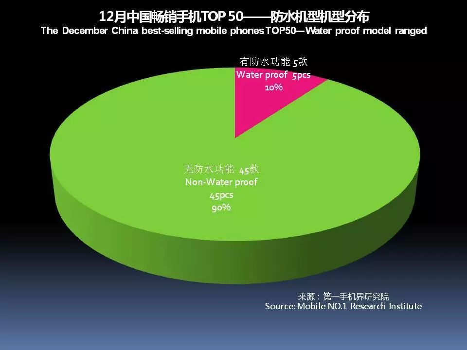 2017年12月畅销手机TOP 50中,具有防水功能的机型有5款,分别是华为 Mate10 、华为 Mate10 Pro 、iPhone X、iPhone 8 Plus 、三星 Galaxy S8+。