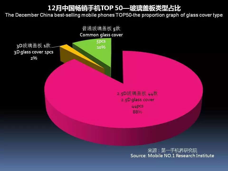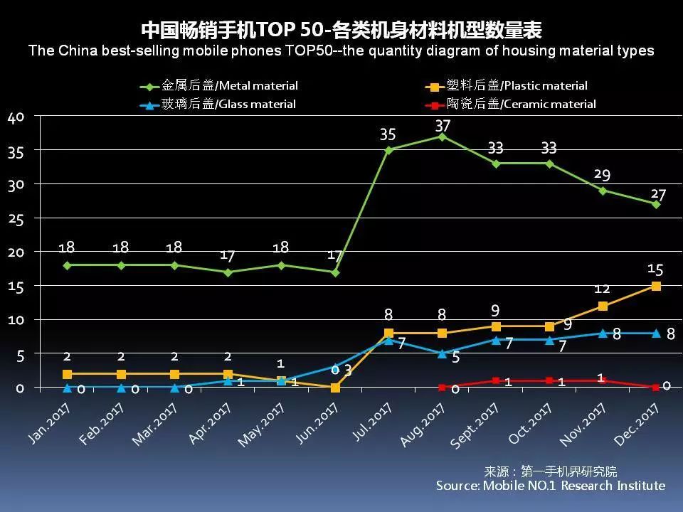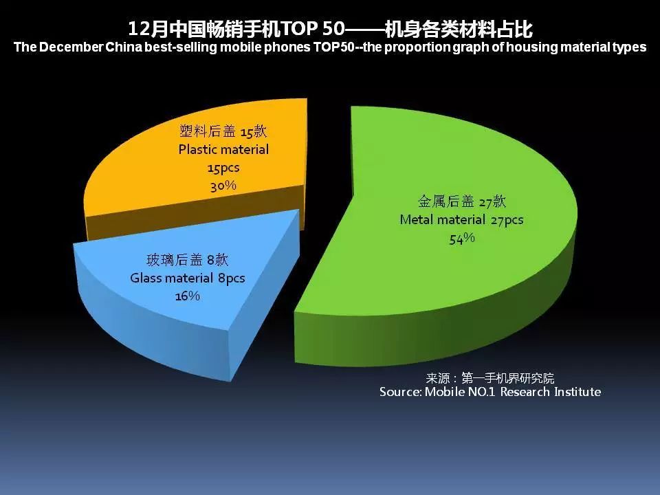 12月中国畅销手机TOP 50,采用金属后盖有27款,占比54%;玻璃后盖的有8款,塑料后盖有15款,陶瓷后盖0款。