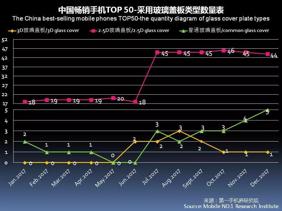 2017年12月中国畅销手机TOP 50中,采用3D玻璃盖板的手机只有三星Galaxy S8+进入TOP 50。