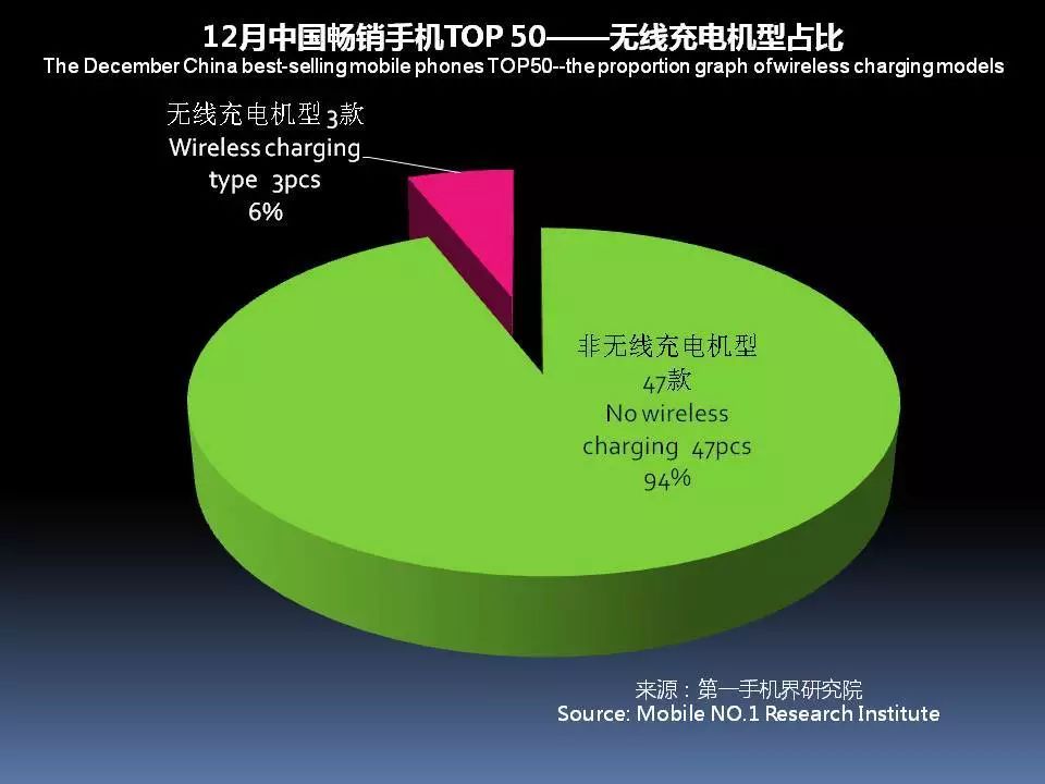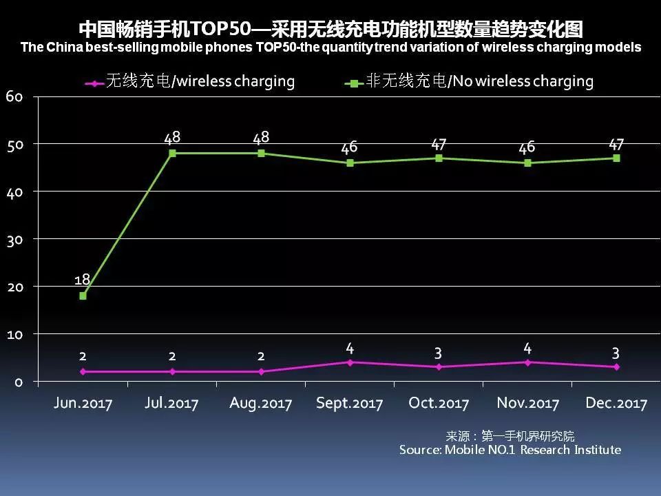 12月中国畅销手机TOP 50中,采用无线充电的机型有3款,占比6%,就是iPhone X、iPhone8 Plus和三星 Galaxy S8+。