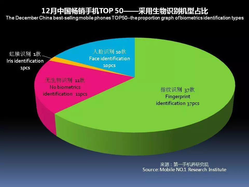 12月中国畅销手机TOP 50,采用指纹识别功能的手机有37款,占比74%;采用虹膜识别有1款,占比2%;采用人脸识别有10款,占比20%,没有采用生物识别功能的手机有11款,占比为22%。