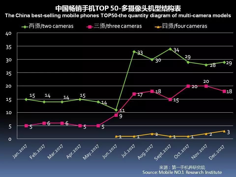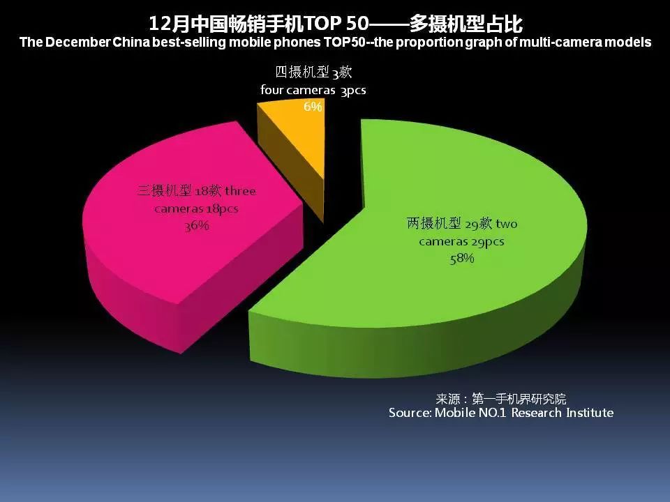 12月中国畅销手机TOP 50中,已有22款机型采用多摄像头设计,占比44%。