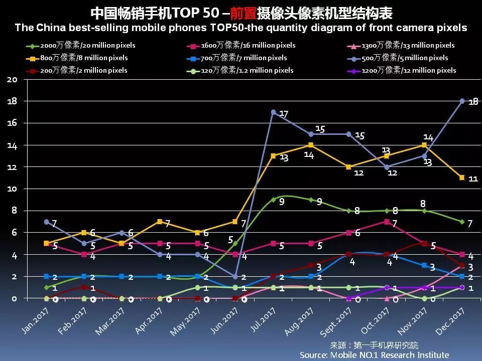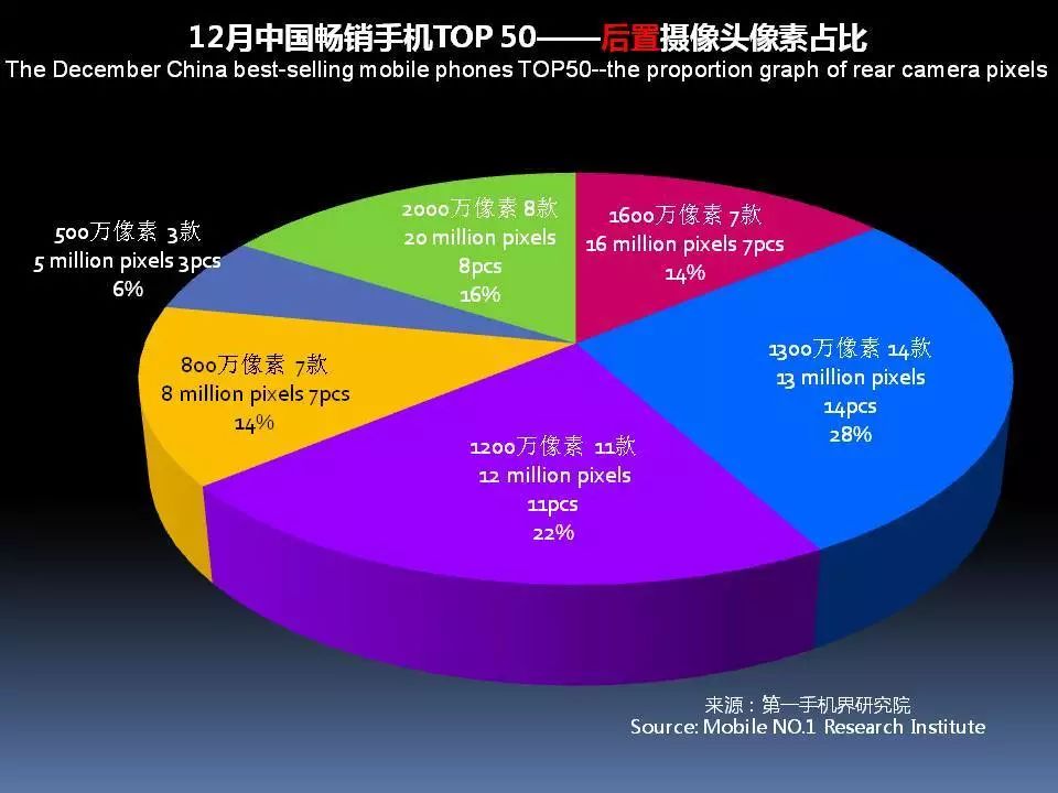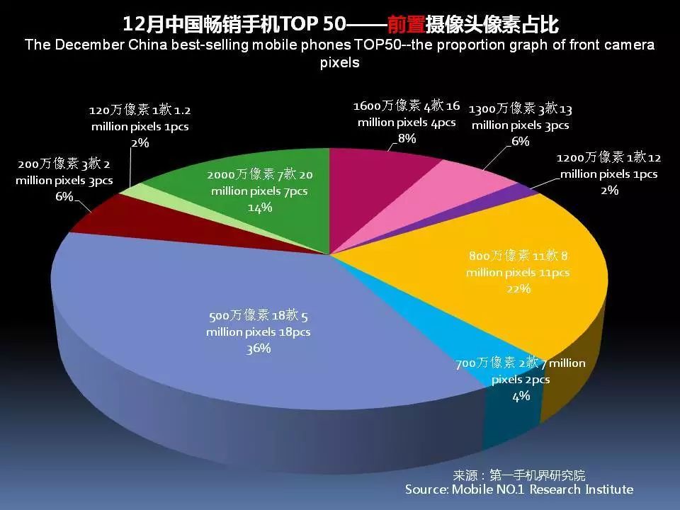 12月中国畅销手机TOP 50中,前置摄像头采用2000万像素的有7款,占比14%;采用1600万像素有4款,占比8%。