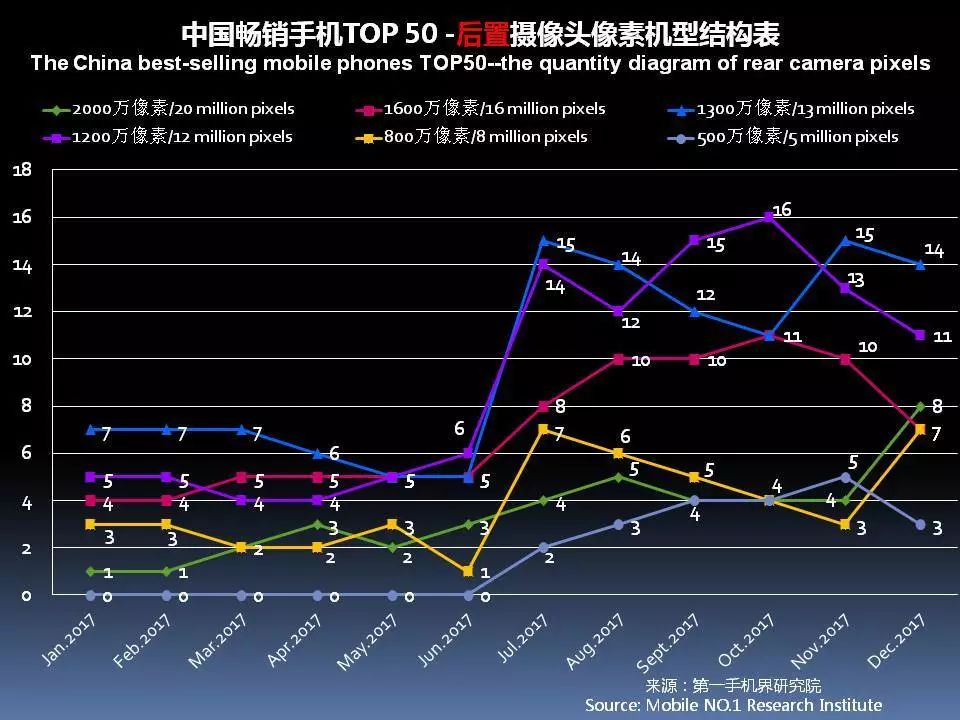 12月畅销手机TOP 50中,后置摄像头采用2000万像素的有8款,占比16%;采用1600万像素的有7款,占比14%。
