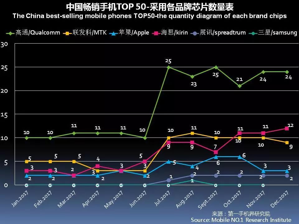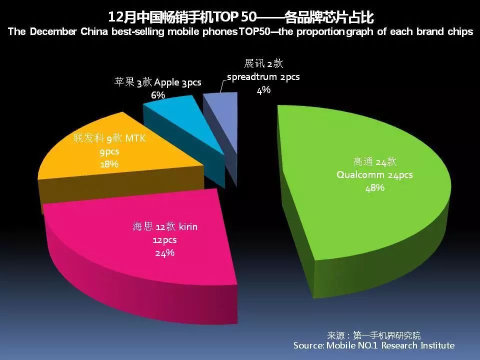 12月中国畅销手机TOP 50中,采用高通芯片的有24款,联发科(MTK) 9款,海思12款,苹果3款和展讯2款。高通芯片占有率达48%的份额。