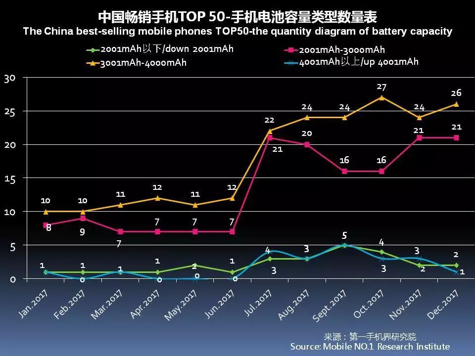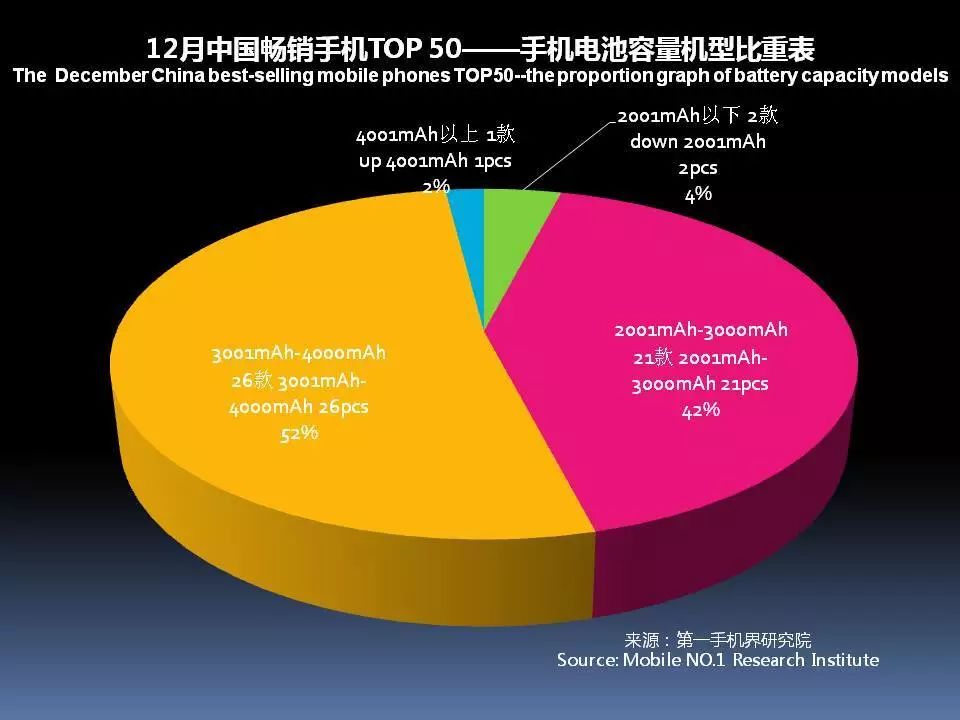 续航能力已经成为手机卖点之一,12月中国畅销手机TOP 50中,电池容量3001mAh-4000mAh的机型数量已达到26款。