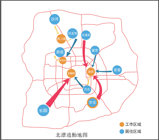 从工作区域看,北京国贸、中关村、望京、西二旗、金融街和亦庄最集中。中关村和国贸的通勤距离高于全城平均值,国贸平均工作日出行半径最长,达到11公里;亦庄最短,为8.6公里。