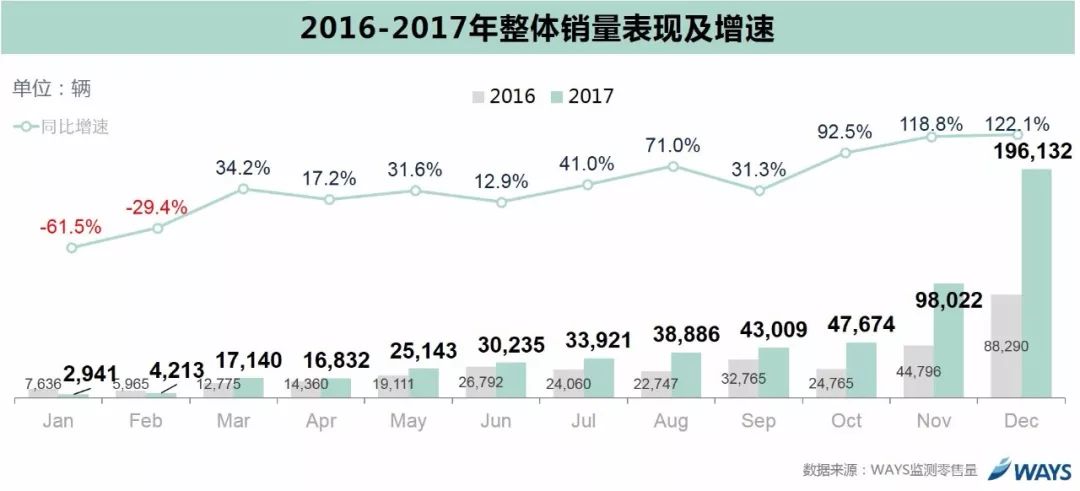据威尔森监测,2017全年新能源乘用车零售量达55.4万辆,较2016年同期增长71.0%,其中,12月表现最为亮眼,单月销量就达到了19.6万辆,同比巨幅增长122.1%。