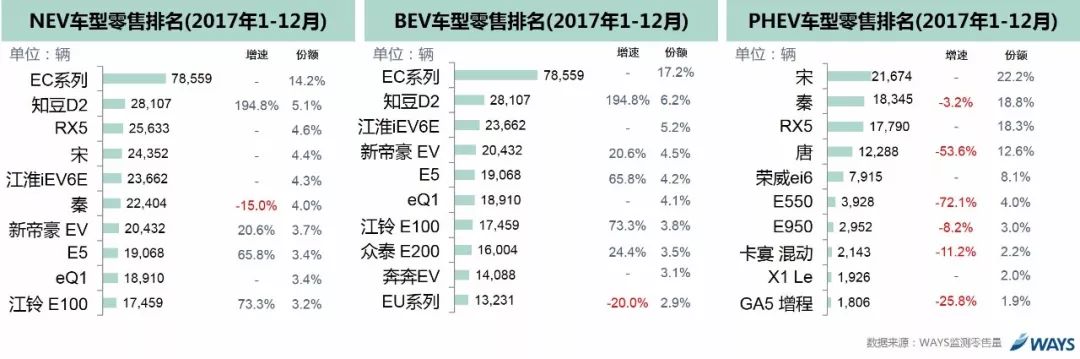 纯电动一直是政策主导的方向,不管是从补贴金额还是积分制度上来看,国家都给予了其插电混动所没有的大力扶持。在产业链扶持政策上,也出台了一系列从中游零部件到下游配套设施上的规范准则与指导意见。政策对于燃料类型的优先级直接影响了市面上产品的种类以及消费者可选择的范围。鉴于2017年国家补贴政策纯电动均值高于插电混动,车企在产品选择上更倾向于生产纯电动车型,在此基础上,据威尔森监测,纯电动车型2017年累计销量达到45.7万辆,同比增长82.2%,占新能源乘用车总销量的82%。畅销排行榜中,纯电动产品EC系列、知豆D2、江淮iEV6E也牢牢占据了销量前三甲,可见政策对于市场燃料结构的决定性影响。