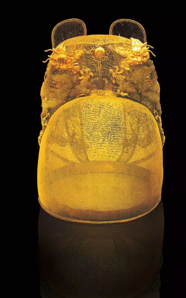 定陵内,万历皇帝的金丝蟠龙翼善冠。整体由518根金丝编成,总重826克,约合22明两。在这精致的手工艺背后,是每一两黄金的来之不易。明永乐年间,在黑山金场,六千人,三个月,仅得金8两;成化年间,在湖广、武陵等十二县二十一处金场,征调民夫五十五万,一年死伤无数,仅得金35两