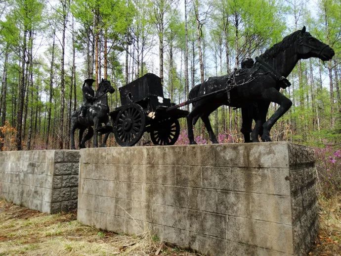 反映清代从嫩江到漠河金矿“古黄金之路”的雕像。在1883年漠河发现金矿后,清政府于此地创办金矿场,并重新整修了始自康熙年间,从嫩江到漠河的驿路,来运输黄金