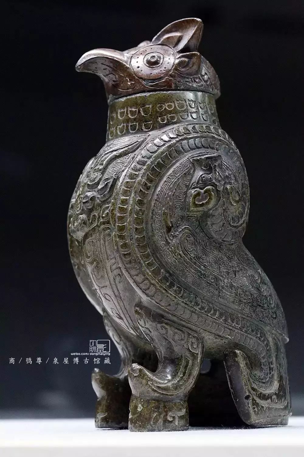 鸮尊,泉屋博古馆藏。音同“消”,俗称猫头鹰,古人认为鸮夜行能辟邪通灵,所以在很多青铜器上均能够看到其形象。古代青铜器原本的颜色接近于黄金,而不是绿锈,这也是其被称为吉金的原因之一