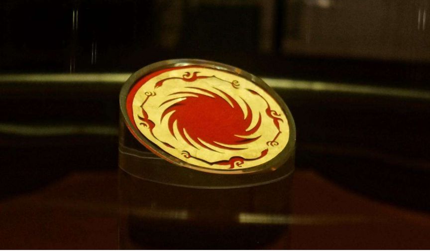 金沙遗址太阳神鸟金饰。出土于成都金沙遗址,整体呈镂空风格,外沿有神鸟四只,围绕中央的太阳旋转,极富动感。2005年,“太阳神鸟”金饰图案被国家文物局公布为中国文化遗产标志,带有其图案的绣品,更是通过神舟六号载入太空,逐日飞天
