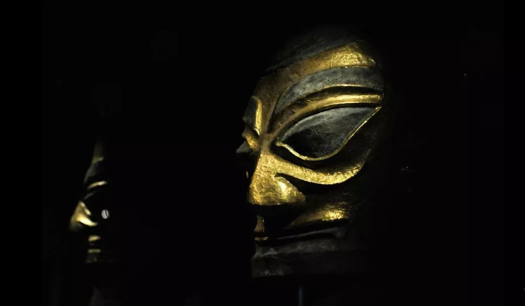 三星堆金面铜人头像。广汉三星堆遗址祭祀坑出土,青铜材质的人像,面、耳部用金皮捶拓制成。金面青铜造像,象征着权威与神圣的阶层,他们具有通神的神秘力量