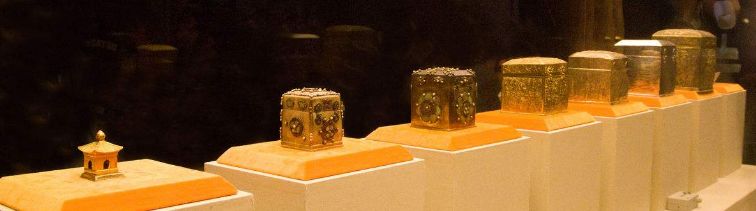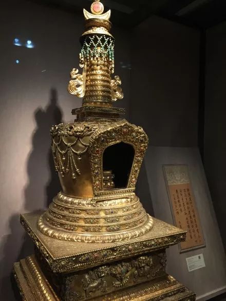 故宫藏金发塔。此塔是乾隆皇帝在其生母崇庆皇太后病逝后,为她修造的一座放置御发的金塔。金发塔由下盘、塔斗、塔肚、塔颈、塔伞及日月6部分组成,共用黄金三千多两