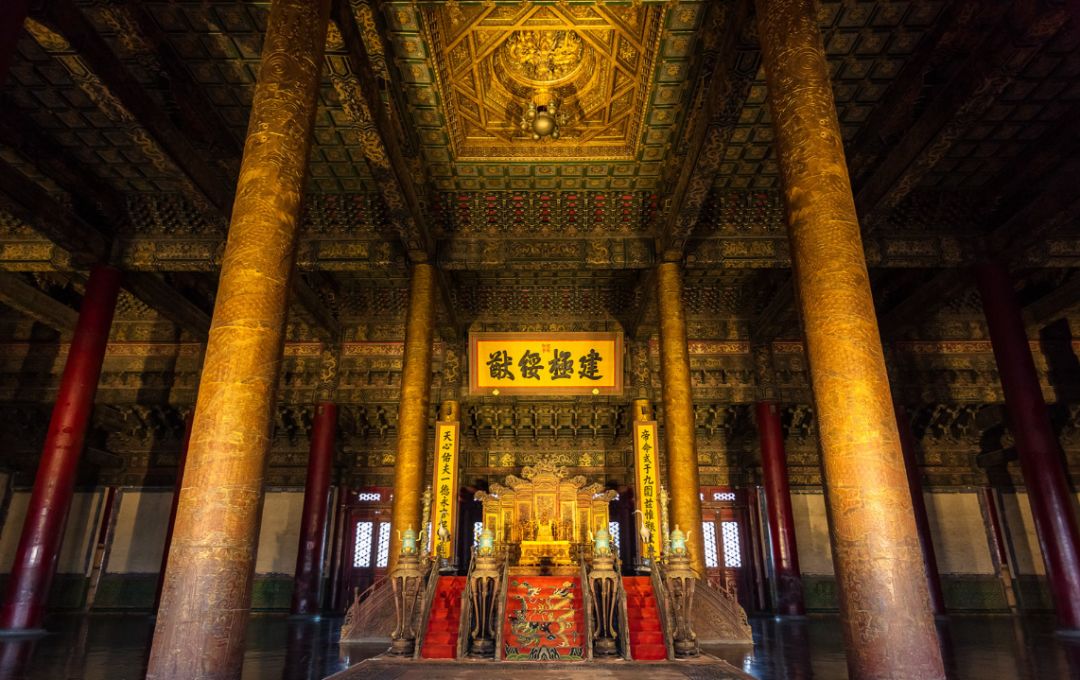故宫太和殿内的六根蟠龙金柱,采用“沥粉贴金”工艺制成。宝座的正上方,为金龙藻井