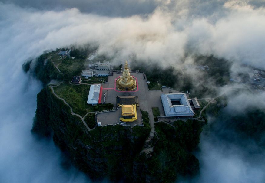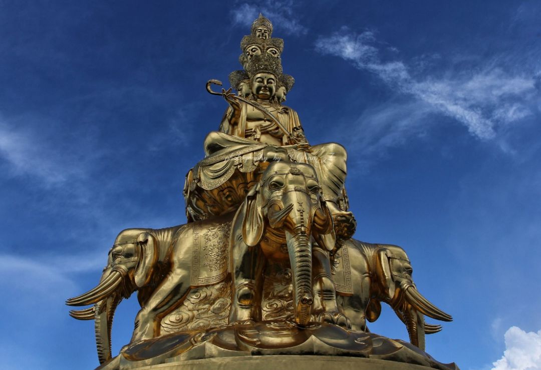 峨眉金顶十方普贤菩萨金像。2006年落成,通高48米,重600余吨。是目前世界上最大的十方普贤菩萨像。2016年,23万片金箔贴于此像,金身重塑