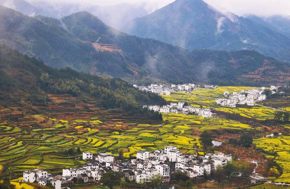梯田里盛开的金黄色油菜花,让远山环绕,粉墙黛瓦的婺源画卷,多增了几分自然的生机