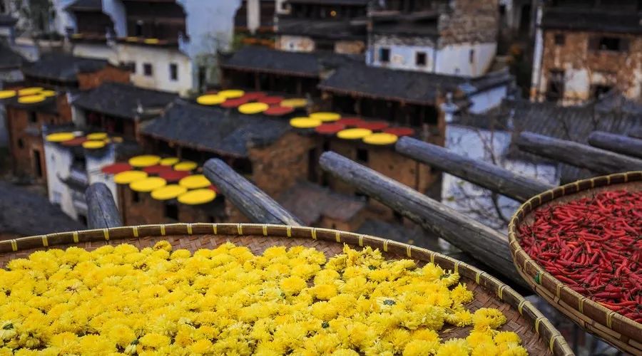 婺源篁岭晒秋,被晾晒在房上的辣椒、皇菊、南瓜、柿子,红与黄的色彩在老屋四周跳跃,舞动着属于这片沃土的丰收与幸福