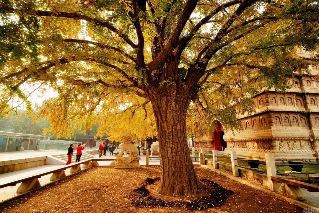 五塔寺内的六百年银杏树。五塔寺原名真觉寺,建于明永乐年间,毁于清末,现为北京石刻艺术博物馆。在仅存的金刚宝座塔前方,有两株树龄达600年的银杏,每到秋天,银杏满地,一派古都的金秋之境