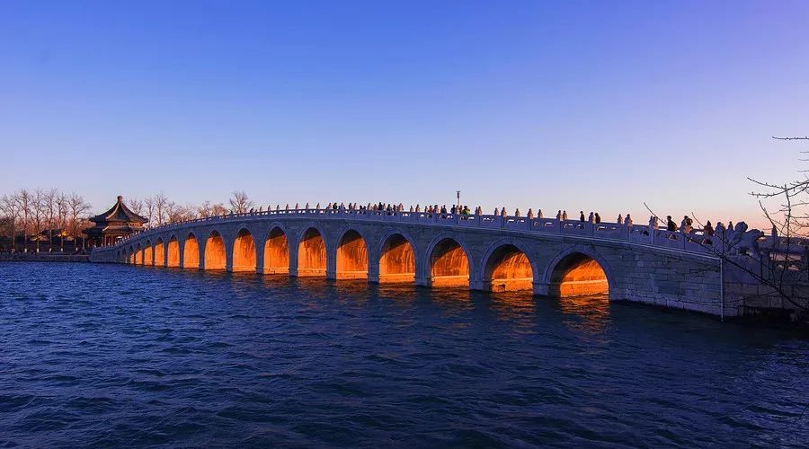 北京颐和园内十七孔桥的“金光穿洞”。十七孔桥,清乾隆年间修建,桥长150米,有17个桥拱,和544个桥栏望柱石狮,是颐和园内连接昆明湖东岸和南湖岛的一座长桥。每年的冬至日前后,十七孔桥便会呈现“金光穿洞”之景