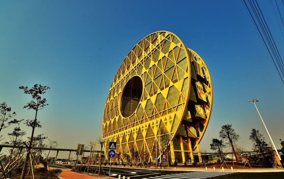拥有夺目金光的广州“圆”大厦。由意大利设计师设计,借鉴了中国古代玉璧的造型。该建筑在民间有“铜钱大厦”和“大金环”的俗称。意大利设计师显然不能理解,中国的金玉并不是在玉上再镀一层金,外面穿金、里面带玉——来代表你多有钱。金玉,是中国人对于才、德、礼、法、道等传统的珍视