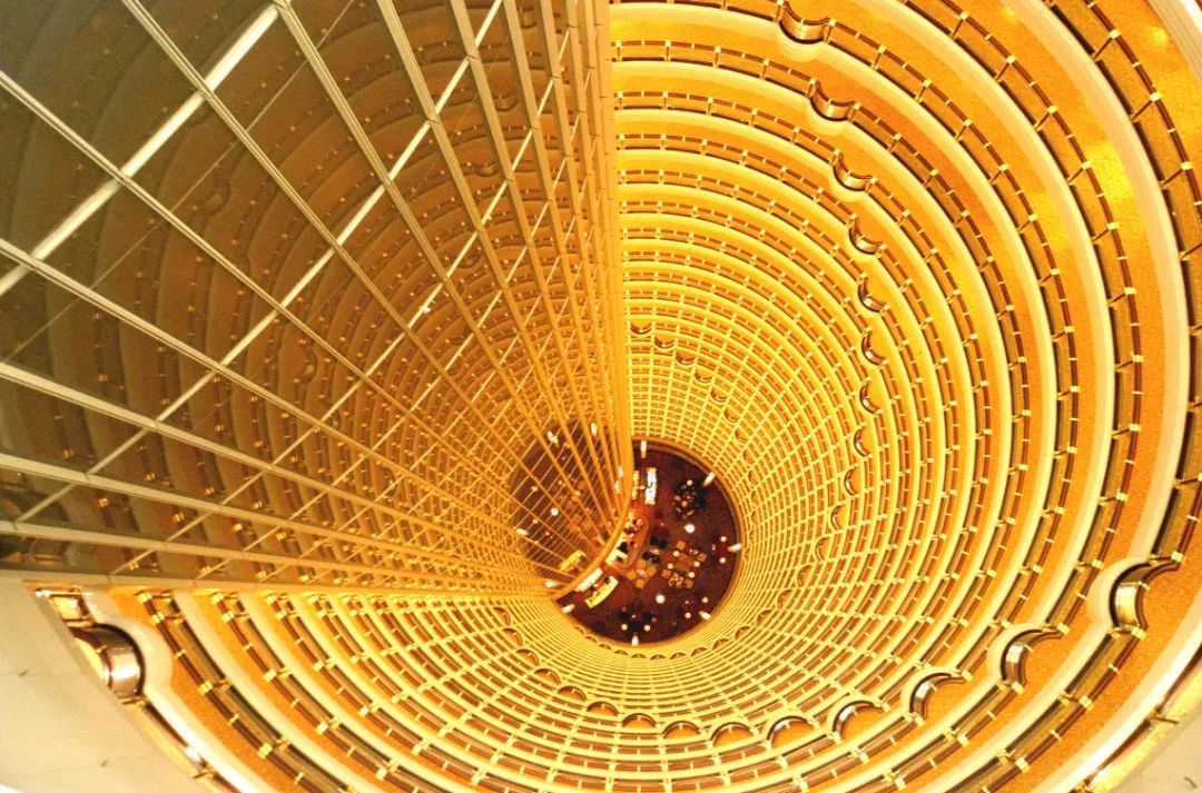 金茂君悦中庭,金色时光隧道。金茂大厦建筑的外观,借鉴了传统的十三级佛塔造型,其内部中庭,更是以金璧辉煌的时光隧道,让建筑的空间呈螺旋状向上无尽延伸。同时使进入建筑的人们,有在过去、现在、未来的时光穿梭之感
