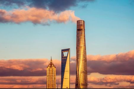 阳光照射下有镀金感的上海“三高”:金茂大厦、环球金融中心、上海中心大厦