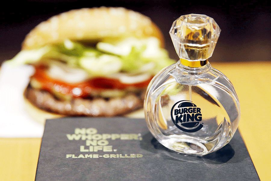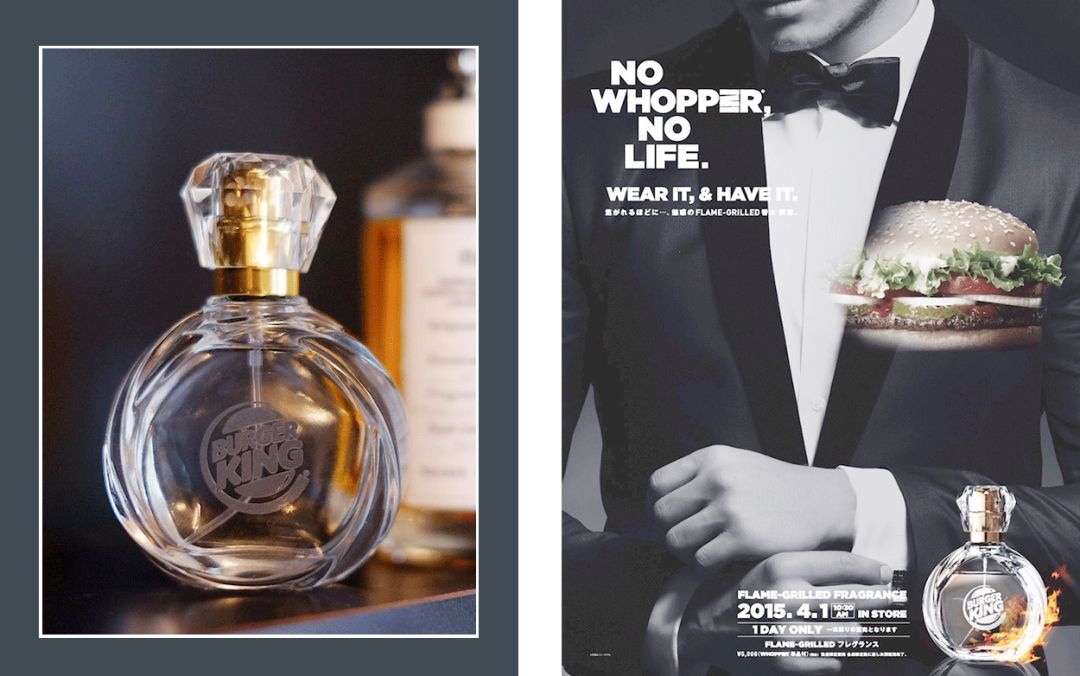 先从正常点的开始说,不然我怕你没看完文章就已经吐了。日本汉堡王15年愚人节的时候宣布推出一款他们家招牌 “皇堡”味的香水,受众是热爱肉类的女性和想拥有性感和野性气息的男性。