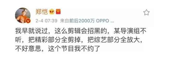 令人意想不到的是,节目播出第二天,郑恺发微博炮轰导演组,声称导演组把精彩部分全剪掉了,放大了综艺的部分,并直言“这个节目我不约了”。