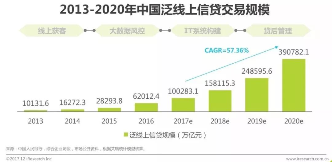 在“线上获客,大数据风控,IT系统构建及贷后管理”四个领域中,不同程度引入金融科技元素后的泛线上信贷领域,2017年交易规模超过10万亿,到2020年复合增长率高达57.36%。如此高增速的背后并非网络信贷单方面的努力,而是传统信贷与金融科技融合达到的效果。换句话说,在互金与传统金融机构的双重推动下,金融科技开始向传统信贷渗透,使得大量传统信贷的交易规模,被纳入到互联网金融的版图中。这也是,线上信贷内涵扩大的主要原因。