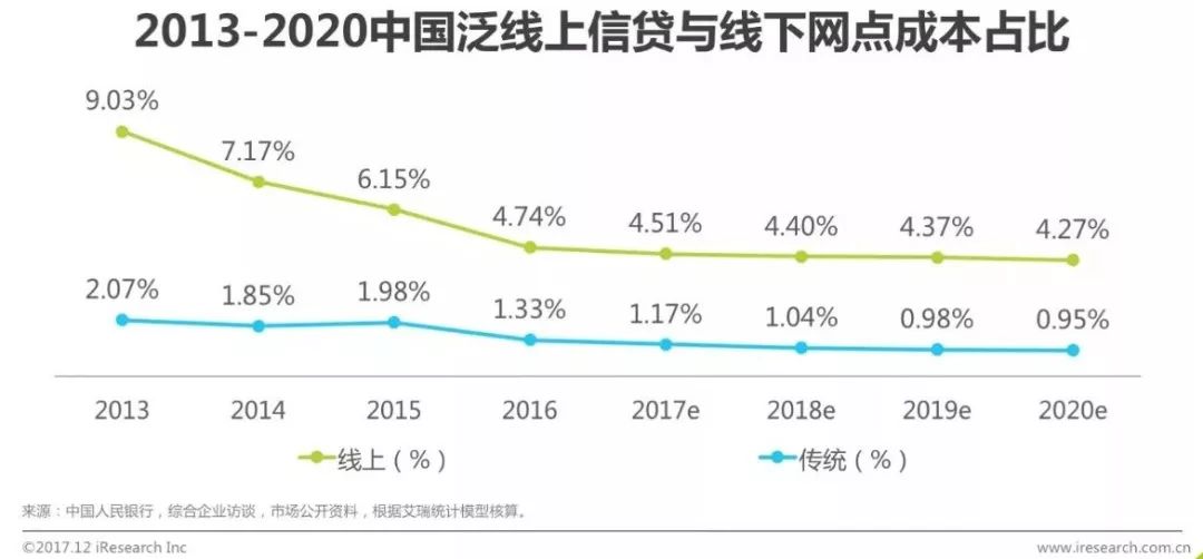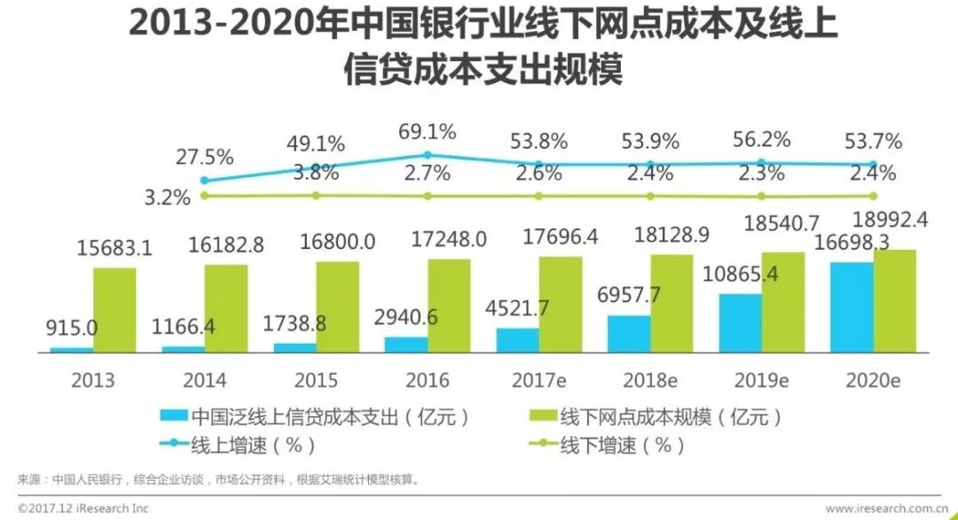 反观网络信贷这一端,成本支出连年提高,而且未来增速依然会保持较高水平。这是互联网信贷终于产生影响力的标志,意味着社会逐步注重线上基础设施的投入。不过这也给全中国的信贷线上化进程加上了时间限制,如果未来线上信贷的规模增速低于成本支出的增速,那么线上信贷就极有可能胎死腹中。