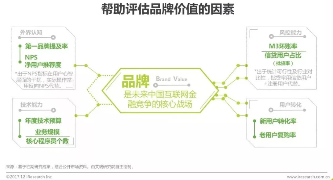 尽管增速放缓,但即便未来保持平均每年40%左右的信贷余额增速,在互联网各行业中也属于高速成长的行业。因此,未来互联网环境将继续承担“资产工厂”的角色,高速高效的生成新资产。而在这一过程中,坐拥资金的金融机构如何进行筛选将变成核心课题。在没有合作风控,或者资本关系的前提下,平台的品牌积淀将成为资金端选择优质资产的重要考量指标。艾瑞认为,以下三点将成为评价互联网信贷机构品牌实力的指标:第一:成立时间,越长越好。第二,平台转化率,高于同业机构,越高越好。第三,复购率,复购率指用户再次借贷行为。在没有深入合作的基础上,考量以上三个指标,能最大限度的帮助企业鉴别资产质量。