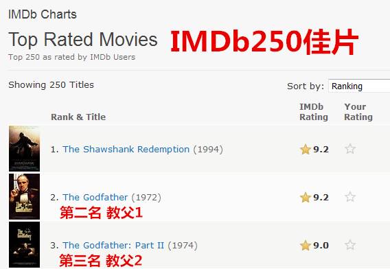 《肖申克的救赎》、《教父1&2》是排名前三的电影