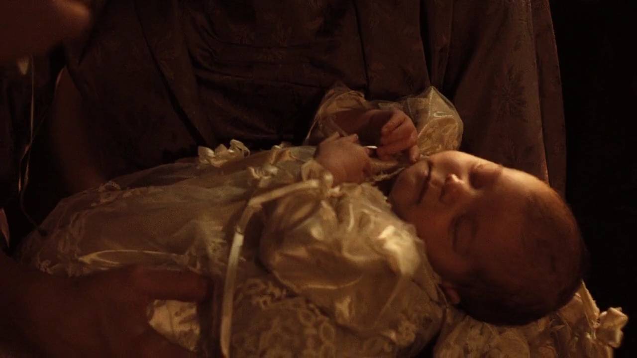 这个构图非常有名的——一个门洞,前景当中是妻子凯特,后景是麦克,重要的家臣们接连走进来,亲吻麦克的手背。