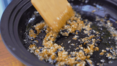 3.加入剩余蒜泥、盐及豆豉调匀(干蒜泥和湿蒜泥混合比较香);