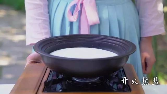4. 锅内放入大量盐开火热盐;