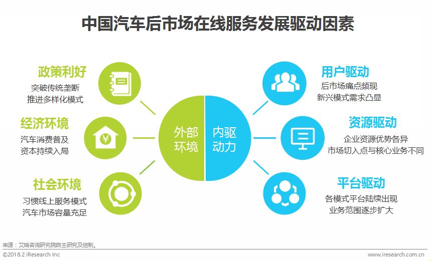 近年来,中国汽车后市场在线服务市场发展迅速,已经成为汽车后市场中核心组成部分之一,是对传统后市场渠道、服务、价格、效率等各方面的优化和升级。在线服务市场的发展离不开外部环境与内驱动力的作用。外部环境中,1)多项相关政策的出台,打破原有传统服务及产品渠道格局;2)汽车消费大众化,消费升级带动更多元化汽车消费,资本更关注市场分散但潜力巨大的后市场领域;3)大众已经习惯线上服务模式,市场容量充足。内驱动力中,1)用户痛点频现,价格合理、高效便捷的模式需求明显;2)企业根据自身资源情况,切入不同垂直领域,核心业务也不尽相同;3)同一垂直领域中,多种模式相继出现,市场竞争激烈,业务范围逐步扩大,服务质量及品质要求提升。