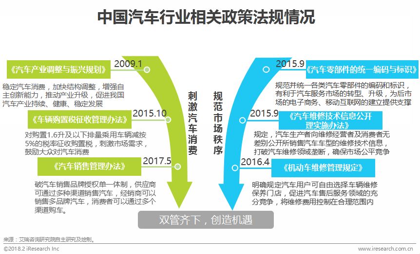 从2009年起,多项政策出台刺激中国汽车消费市场高速发展,尤其1.6升及以下排量乘用车购置税降低,极大促进中国汽车产销量保持快速增长,随之汽车保有量也迅速提升,为中国汽车后市场提供充足市场容量和想象空间。另一层面,2015年开始,汽车零部件、维修技术等相关法规出台,旨在打破维修、零部件市场垄断情况,确保信息更加透明化,市场渠道多元化,让汽车用户自由选择的权利。从刺激需求和规范秩序两方面,双管齐下,促进市场有序竞争。