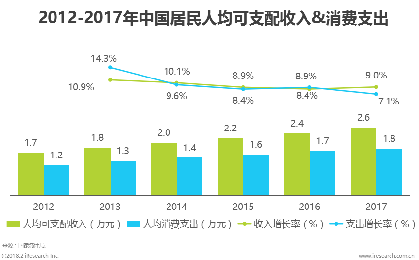 随着国民经济水平的提高,中国居民消费能力和消费水平持续增长,2017年人均可支配收入达2.6万元,人均消费支出达1.8万元;中国居民可支配收入和消费支出均保持稳定增长,消费能力稳步提升。在用户的消费支出构成中,交通通信成为仅次于食品烟酒和居住两项必需支出之外的最大支出项目,汽车消费成为大众消费类型之一。