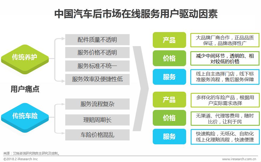 在中国汽车后市场养护和车险服领域,传统服务模式痛点频现。传统汽车养护中,配件质量、服务价格不透明,服务质量和效率低,售后保障差等因素一直影响用户体验,在信息化、智能化时代,用户对产品质量、价格,服务效率都有更高的要求,在线服务符合用户需求。对于传统车险,车险价格混乱、服务流程复杂、理赔周期长是长期存在的问题,在线车险有效地优化服务理赔流程,减少渠道、代理费用,真正做到让利于民。