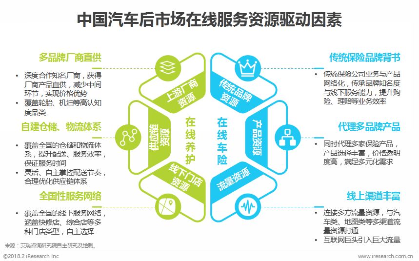 中国汽车后市场在线服务的快速发展离不开各类资源,合理利用和整合企业核心资源,提升用户满意度,打造在线服务优势。在线养护市场中,在线养护企业与更多品牌产品深度合作,获取更低的产品价格,同时配套自有供应链建设以及全国性合作服务网络,实现从上游供应到下游服务的完整覆盖,通过互联网、大数据、信息管理等技术支持,打造高品质、高性价比的服务体验。在线车险市场中,在线服务平台具备更强流量资源以及产品资源,获取更多精准用户,并提供更多产品选择,提升用户购买、理赔等全方位体验。