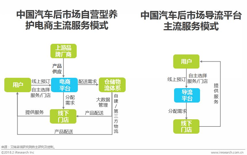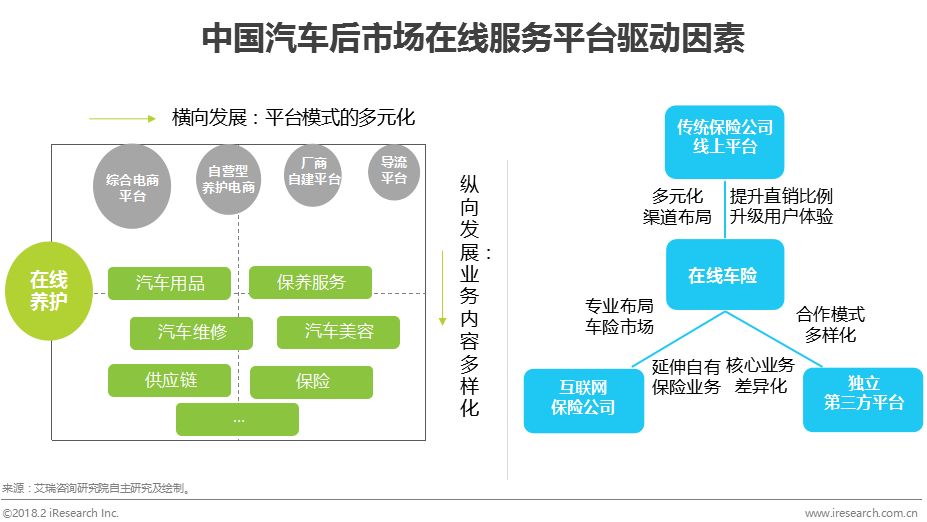 在中国汽车后市场中,在线服务平台和模式层出不穷,尤其移动互联网的普及,汽车后市场中汽车养护、车险、二手车等垂直领域在线服务开始快速发展。在汽车养护领域,综合电商、自营型养护电商、厂商自建平台、导流平台等多种模式共同服务市场,其业务范围也从标准化汽车用品、保养服务,延伸至维修、美容、供应链等服务,从而提供更多、更好的服务。在车险领域,多模式平台入局,运营模式、目标用户、商业目标不尽相同,但所有模式和服务均旨在打造更好的服务体系,提升更优质的服务体验。