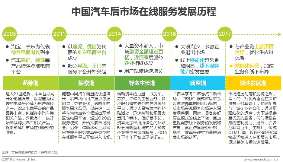互联网时代到来以前,传统线下交易、服务是中国汽车后市场主要服务模式,其价格体系、服务效率、服务质量等方面一直存在诸多痛点。随着互联网的普及,综合电商的出现成为后市场在线服务的起点,在线服务由最初仅购买汽车相关产品到垂直领域电商及服务平台的出现,再到实现线上与线下服务的深度结合的服务模式。现在,后市场在线服务已经向服务优质化、产品多元化、价格合理化、流程简单化等方向发展。随着巨头和资本进入,整体市场将迎来更快的发展。