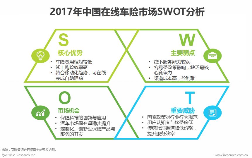 现阶段,中国在线车险市场发展处于起步阶段,车险互联网化程度较低。尤其在车险费改以及保监会下发《关于整治机动车辆保险市场乱象的通知》后,在线车险市场受到明显影响。2016年在线车险市场保费出现大幅下降,2017年在线车险占比也进一步下降。可见,目前中国在线车险暂未具备核心的竞争优势,缺乏合适竞争力。但对于处于调整期的中国车险市场而言,产品创新、服务创新、模式创新将成为未来发展机会,通过对大数据、人工智能、云技术等探索应用,打造更具竞争力的产品与服务。
